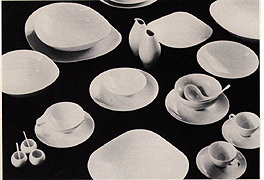| Eva Zeisel's first dinnerware as a refugee in the United States: The MOMA Collection. Pictured is the coffee service. | ![]() |
