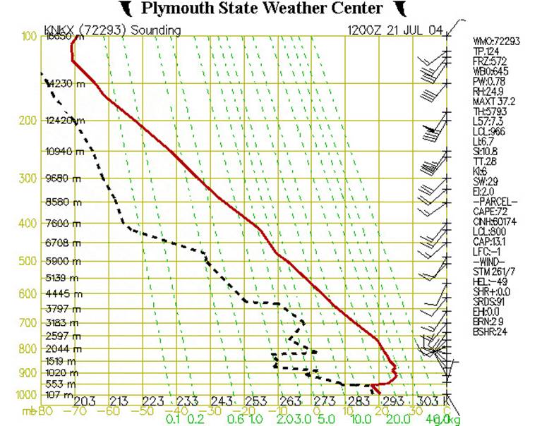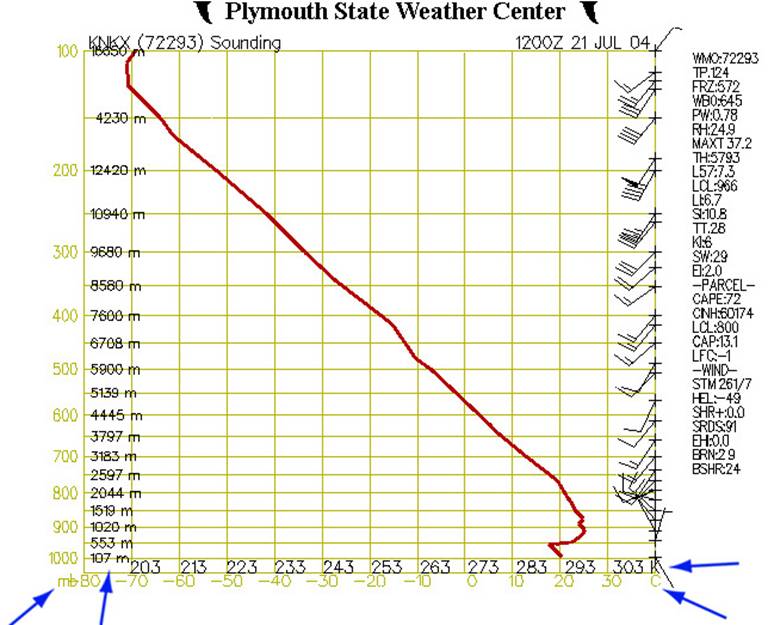 Along the right side of the chart are barbs showing wind speed and direction. The red line shows how the air temperature varies with altitude. Note that on this example chart the temperature at first decreases with altitude, then begins to increase (an inversion layer) around 550m, then decreases again by about 1300m on up.