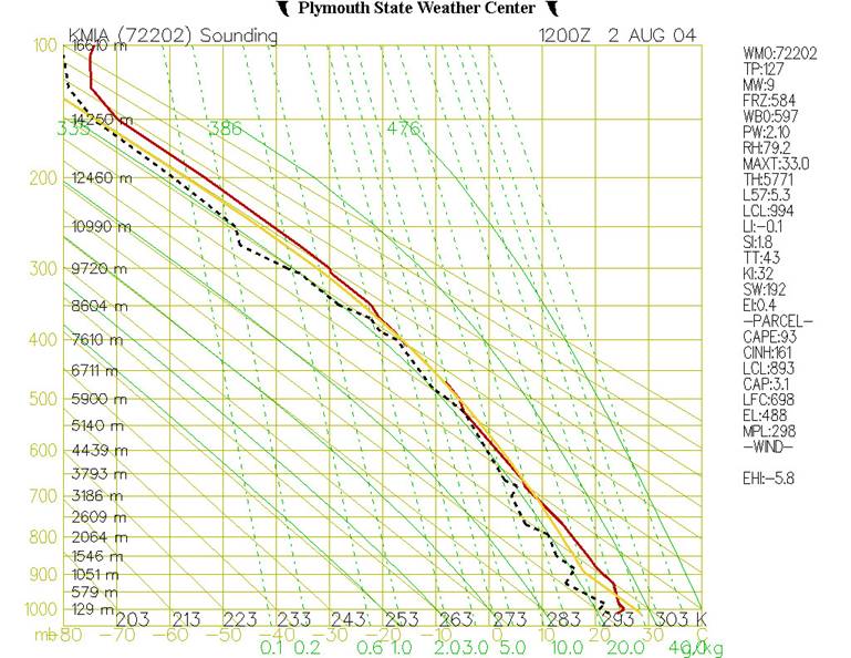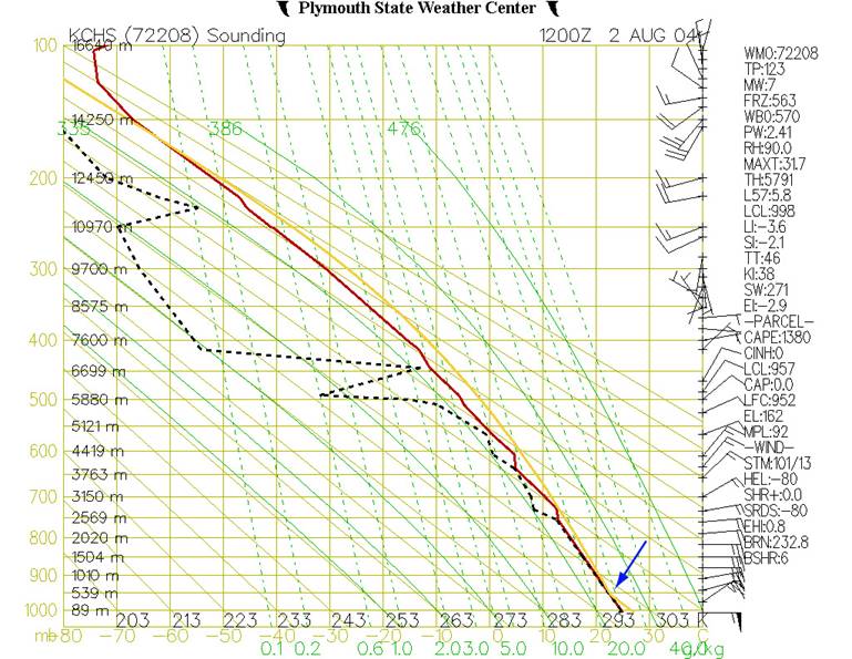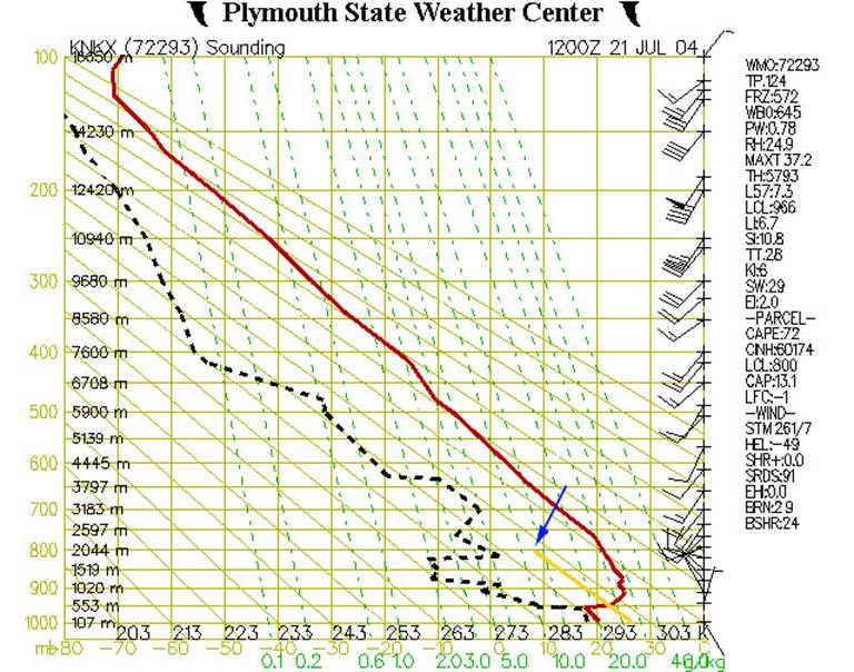 The altitude(or pressure level) at which this happens is the lifting condensation level (LCL). This is the point at which moisture contained in a rising parcel of air can begin to condense. (Note, this is shown in the list of data at the right-hand side of the figure. Look under “PARCEL”, then find “LCL:800”. This indicates that the lifted air parcel would reach its lifting condensation level at 800 mb.)