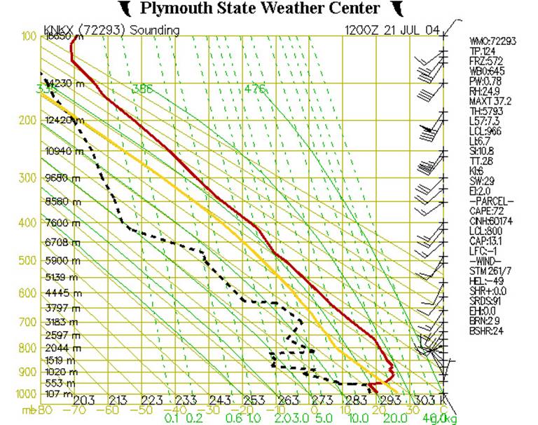 We can use the position of the yellow line relative to the position of the red line to see what weather conditions to expect in various locations. Wherever the yellow line lies to the left of the red line means that the air parcel is cooler than the surrounding air and will only rise by forcing (through vertical winds for example), and the atmosphere is said to be stable. These kinds of conditions lead to the trapping of air (and pollution). Wherever the yellow line lies to the right of the red line means that the air parcel will rise on its own, without any forcing, because it is warmer than the surrounding air; the atmosphere is said to be unstable. This kind of condition is more likely to lead to thunderstorms. For example, if an air parcel reaches saturation and is lifted to an altitude at which it’s warmer than the surrounding environment, then the level of free condensation (LFC) is reached. This type of a situation is an ideal environment for thunderstorm generation.