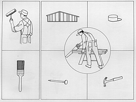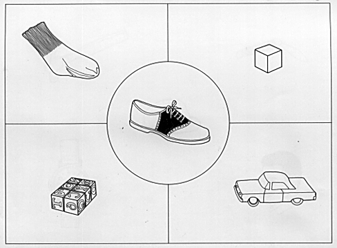 This is an example of a INNER CONCEPTUAL task in the Visual Modality. Please note that the instructions must be given prior to testing the child or adult. This is done through pantomime and/or by simple modeling. This is necessary, of course, because we do not know before we test what the child's ability is to understand langauge.