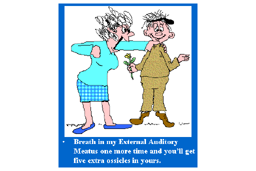 There is a quaint line I once heard in a Humphrey Bogart movie (I think) that goes like, "Breath in my External Auditory Meatus one more time and you'll get five extra ossicles in yours." And then again it may have been a Bugs Bunny cartoon.