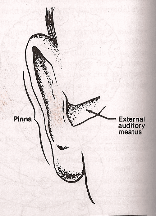 Somewhat centered in the Pinna is the ear canal. That is what we called it in CD 261; but this a 300 level course so it is now referred to as the External Auditory Meatus.