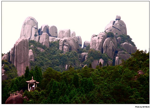 Lovers' Rock (right, rock formation looks like two hugging lovers sitting side-by-side) in Taimu Mts in eastern Fujian, AA-class tourist destination |