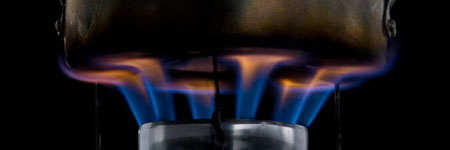 In this Forbes Conrad photo detail, note how the Penny's laminar flow jets hit the pot surface, creating turbulence, mix with the air, and burn to create seven hot spots - including the central glow from gases released from the penny pressure regulator. Using your imagination and you can almost feel oxygen being sucked up between the jets.