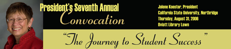 It’s not just the faces of administrators that have been changing. So, too, have our faculty. In the past six years, about 250 of our tenured faculty have retired, and we have hired 316 new tenure-track and tenured faculty. This academic year we have 56 new tenure-track members of the faculty. Think of this change proportionally—we have a total of about 750 tenured and tenure-track faculty at the university; therefore, in the past six years the faces of our faculty have changed by about 40 percent. But while the individual faces of this great university are always changing, the strength of our mission, of our collective goals, and of the university’s impact on this region remains strong, vibrant, and powerful. The community certainly appreciates the incredible physical metamorphosis that we have undergone, but what truly has been awe-inspiring is the increasing recognition of the university for the quality of our students, faculty and staff, and our contributions to the community. There is growing enthusiasm for Cal State Northridge—within the San Fernando Valley, the greater Los Angeles Basin, the nation, and beyond. It is from this wellspring of growing support for our university that I speak to you today about our “Journey to Student Success.” While the theme is straightforward and simple, the actual journey is challenging and complex. My remarks this morning will be in three segments: first, I describe the nature of our journey these past six years and the territory we will navigate during this coming year. Second, I will return once again to the theme of student success. Finally, I will close with some verbal highlights—postcards and snapshots if you will—from our journey in this most recent year. I. The Journey First, the journey. Six years ago we began a journey together here at Cal State Northridge to change key aspects of how we work with and for our students. While the university’s mission and vision have remained the same, we set out to change how we achieved that mission. We identified the importance of improvements and new capabilities—what I have called the “four priorities.” Along the way we determined that we should move to become a more learning-centered university. Along the way we were buffeted by external forces, such as serious budget reductions, that affected our ability to stay on course. Trustee policy calls for a comprehensive review of a president in her or his sixth year. This past year was that year for me and for Cal State Northridge. The review process is very thorough and culminates in a letter from Chancellor Charles Reed to the campus community that has recently been posted to the University’s web site. While the review is certainly about my work here, it is fundamentally a review of the efforts and focus of the entire campus community. Using the four priorities as the framework, let me provide you with a few of the review’s highlights to underscore what we have accomplished together. Remember the priority to strengthen the University’s connections to the community? The review concludes that we have increased the public profile of the university and that community relations in the San Fernando Valley are strong and are growing stronger. Remember the priority to improve the private fund raising capabilities and successes for the University? The review also cites a major increase in donor gifts to the university. From the end of 2000-01 we have almost doubled the private gifts given to this university in reaching in 05-06 $23 million in pledge payments and new commitments. Our third priority was to create a more user-friendly campus. Praised in this review are the enhancements to the physical aesthetics of the campus and our efforts to make it easier to navigate. Not surprisingly, our work to build more parking structures and to improve information technology was noted positively. Fourth, and most importantly, we embraced the priority to improve the graduation rates of our students. The review commends us for identifying and implementing numerous initiatives to improve student retention and graduation rates. It also acknowledges the work of our faculty for major revisions to our general education program. We should celebrate how far and how well we have traveled, but we must also recognize that for each of these priorities we have additional territory that must be covered. We have traveled this far on our journey because we have a shared commitment to the mission and to the changes we have sought in how we accomplish that mission. Planning for this journey of change, improving, and building on our strengths has been a preoccupation for many in this campus community. While we have accomplished much, it is now time to turn attention to strengthening our planning process by broadening and improving the planning process itself. While the four priorities remain constants, it is now time to engage the campus community more fully in determining all the elements of our road map for the future. Why do we need to re-define and refine the “how” of our planning? To borrow a beautiful phrase from the poet Elizabeth Barrett Browning, “let me count the ways”: