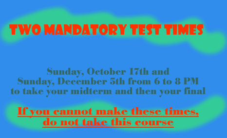 MAKEUP EXAMS WILL NOT BE GIVEN. Therefore, The student must take the midterm and final at the assigned time for credit to be received.