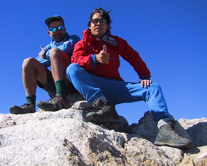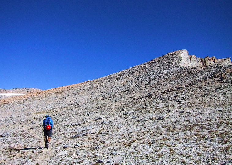 The Southwest ridge of Mount Conness--a fairly hefty climb (Grade V, 5.10c) but something to aspire to. It was pretty cold here with the wind whipping by the face. On the way down to the face we saw some clear ice coating the rock. |
