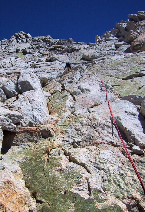 Rudy follows one of the early pitches (rope lengths) of the climb. Even though the wind is blowing hard the climbing is easy and the rock was great. |