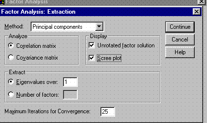 Ask for Principal Components; Correlation Matrix; Eigen Values over 1; Unrotated Factor Solution; Scree Plot; and, 25 maximum interations.