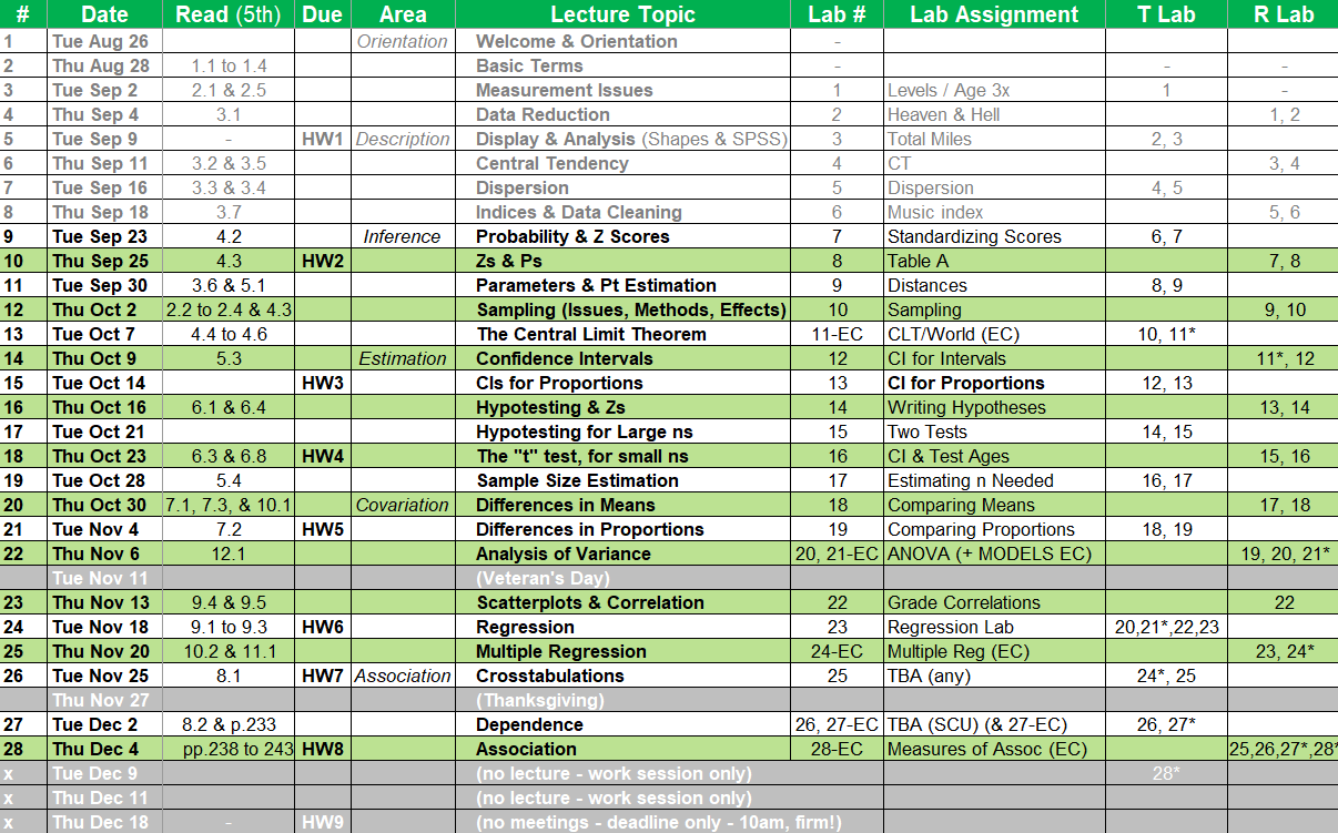 This is a required course in elementary statistical methods for social science applications. The purpose is to introduce the logic and procedures of descriptive and inferential statistics. As such, the goals are to: develop basic skills in statistical reasoning; promote the intelligent use and consumption of statistical information presented in the media; gain familiarity with the use of a computer in statistical analysis and sociological research; and provide a foundation for further study (esp. SOC 497 & 498). |