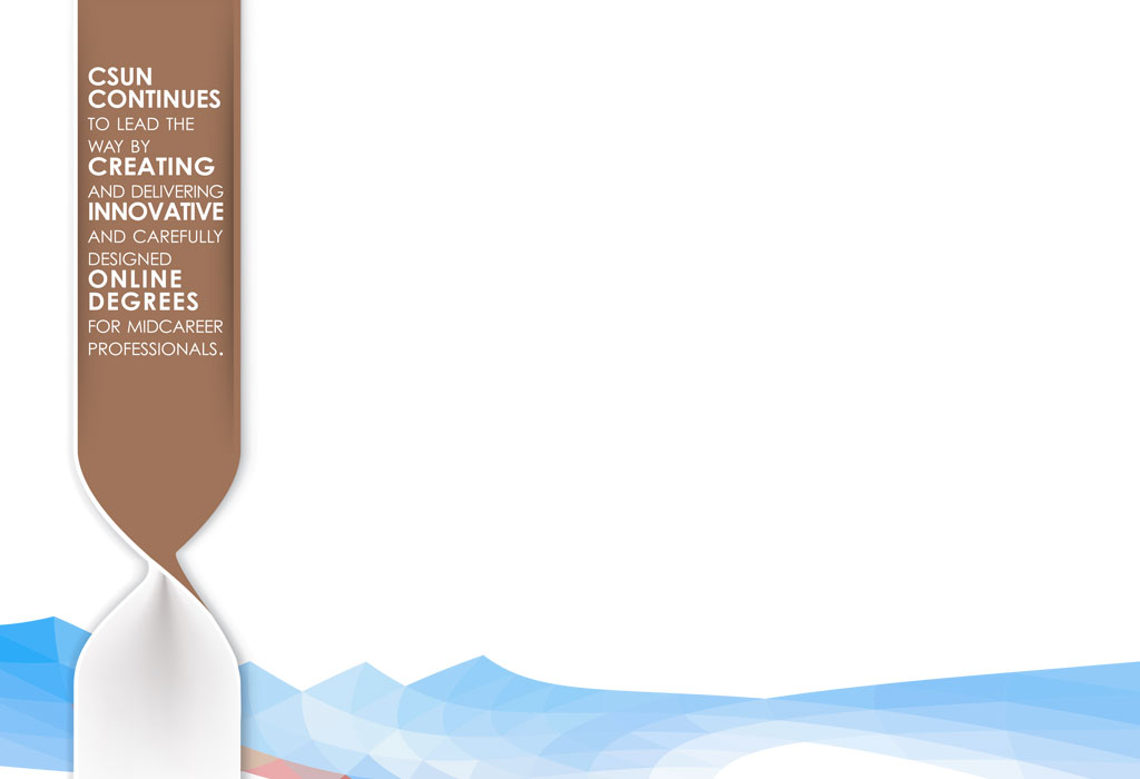 California State University, Northridge was among the first major public universities in the nation to offer students master’s degree programs fully online. CSUN continues to lead the way by creating and delivering innovative and carefully designed online degrees for midcareer professionals. As recently as 2013, CSUN’s first online degree program, created over a decade ago, won the Outstanding Program Award bestowed by the University Professional and Continuing Education Association (UPCEA).