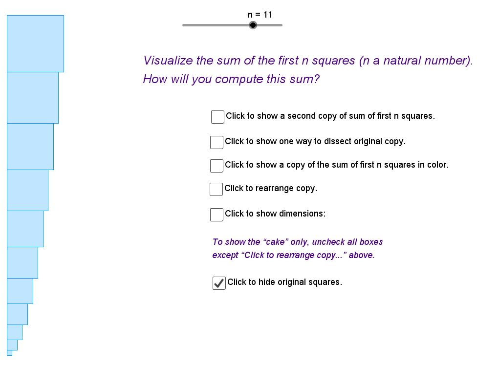 Now that you know (and/or remember) the formulas for (1) the sum of the first $n$ natural numbers and (2) the sum of the squares of the first $n$ natural numbers, you should practice using the formulas. Click on the following link to do this now: Practice Some Sums (with GeoGebra).