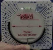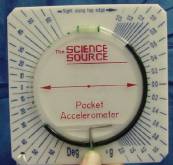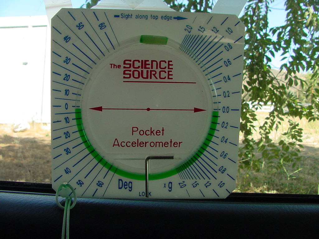 If you can’t buy a fancy pocket accelerometer, it is easy to make one with a protractor, string and a weight at the end of the string. With zero acceleration, the weight hangs vertically at the 90o mark. During acceleration, measure the angular deflection of the string. The greater the angle, the greater the acceleration. |