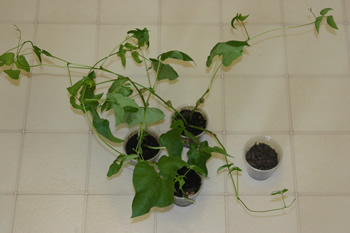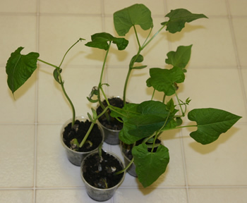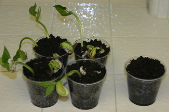 Begin with sprouted lima beans and moistened soil in 4 small cups