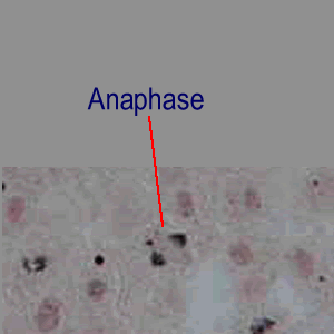 This is probably a bit more distinguishable in the plant cells. There are now two bunches of chromosomes, (the chromatids have separated and are more toward the poles). |