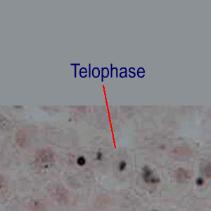 In both the plant and animal cells, the individual chromosomes are no longer distinguishable and the darkly stained genetic material is incased in new nuclear membranes. What evidence of cytokinesis do you see in each picture? |