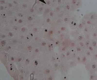 In both slides, you should be looking for a distinct nucleus, there is the possibility of seeing one or more nucleoli as darker stained regions inside the nucleus. The nucleus of these cells is particularly large. |