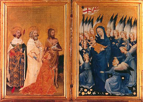 St Edmund, king and martyr, St Edward the Confessor and St John the Baptist present the kneeling monarch Richard II of England in the left panel to the azure assembly of the Virgin and Child, attended by angels, on the right panel. The left scene is set in an earthly forest, the right in the flowering garden of heaven.