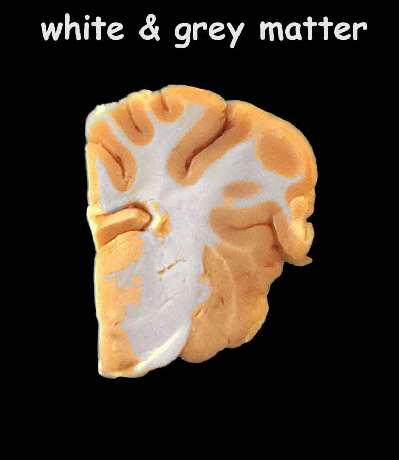 In unstained tissue, the fiber areas appear white or light because of the myelin sheath surrounding the axons. Cell bodies do not have a myelin covering, so areas in which cell body density is greater appear slightly darker and greyish. This relationship is the basis for the terms gray matter(cells) and white matter (axons). |