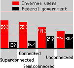 Apart from the crowdPoliticians would do well to transcend their current obsession with dirty pictures on the Internet and start talking and listening to this vibrant, new community. A vast, well-educated, communicative, intensely political constituency remains up for grabs. And increasingly they consider themselves a distinct political entity - 39 percent of Connected Americans say they consider themselves members of a "Digital Nation." The Connected constitute a distinct political subculture. They see the world as being driven by decentralized growth and opportunity, rather than a fixed ideology imposed by a central authority. In their eyes, Bill Gates has about as much influence over the fate of the nation as Bill Clinton. By a margin of 58 to 33 percent, most Americans say the president has a greater overall impact on the country than the founder of Microsoft. But the Connected are almost equally divided as to which man will affect the country more.This should come as no surprise. As Connected Americans have watched Bill Gates become a billionaire, his company has grown into one of the most powerful forces on the planet. They've watched as Gates's corporate culture has quickly - and sometimes ruthlessly - reinvented, expanded, and equipped the world in which we live. By comparison, government seems nearly paralyzed, mired in squabbles and sadly bereft of creativity as Republicans and Democrats endlessly lock horns - often at the expense of the public and its needs. But the real significance of this finding goes beyond Gates and Clinton themselves. It suggests that for Digital Citizens, entrepreneurs and companies are seen as more effective agents of change than conventional politicians. For this reason, I dissent somewhat from the findings of the Digital Citizen pollsters. Despite the general satisfaction many Connected Americans expressed with the two-party system, the countless online discussions about politics that I've had over the years have convinced me that technologically savvy Americans feel endemic disenchantment with the way our civic institutions perform. Affection for the two-party system aside, I believe the two political cultures are on a collision course. The Digital Citizens' rationalism, knowledge, belief in the free exchange of information, and passion for change are all antithetical to the political culture of Washington. And as they grow in strength and number, it seems to me that Digital Citizens will inevitably take a tougher look at political institutions which seem trapped in antediluvian models of communication and problem solving. This may make our current crop of political leaders nervous, but in the long run I'm convinced that the US has nothing to fear from Digital Citizens - they are deeply democratic and relatively prosperous, and thus more likely to work within the system instead of trying to overthrow it. Furthermore, this is