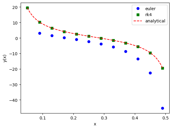 import numpy as npimport matplotlib.pyplot as pltdef f(x,y):return- (30/(1-x**2)) + ((2*x)/(1-x**2))*y - y**2def y_analytical(x):''' The analytical expression is obtained from Mathematica using DSolve[] ''' yx = (((1.4591566243681633e6+ x * (3.5873015873015874+ x * (-2.1887349365522448e7+ x * (-13.333333333333332+ x * (5.107048185288571e7+ (10.+-3.0642289111731425e7* x) * x)))) + (-0.23809523809523808+3.5714285714285716* (x **2) +-8.333333333333334* (x **4) +5.* (x **6)) * np.log(1.+-1.* x) + (0.23809523809523808+-3.5714285714285716* (x **2) +8.333333333333334* (x **4) +-5.* (x **6)) * np.log(1.+ x)) / (0.13544973544973546+ x * (-1.459156624368163e6+ x * (-1.5555555555555556+ x * (6.809397580384762e6+ (2.+-6.128457822346285e6* x) * x))) + x * (0.23809523809523808+-1.1111111111111112* (x **2) + x **4) * np.log(1.+-1.* x) + x * (-0.23809523809523808+1.1111111111111112* (x **2) +-1.* (x **4)) * np.log(1.+ x))) / (1.+ x)) / (-1.+ x)return yxdef euler(f,a,b,n,yinit): h = (b-a)/(n-1) xs = np.linspace(a,b,n) ys = np.zeros(n) y = yinitfor j,x inenumerate(xs): ys[j] = y y += h*f(x, y)return xs, ysdef rk4(f,a,b,n,yinit): h = (b-a)/(n-1) xs = np.linspace(a,b,n) ys = np.zeros(n) y = yinitfor j,x inenumerate(xs): ys[j] = y k0 = h*f(x, y) k1 = h*f(x+h/2, y+k0/2) k2 = h*f(x+h/2, y+k1/2) k3 = h*f(x+h, y+k2) y += (k0 +2*k1 +2*k2 + k3)/6return xs, ysif__name__=='__main__': a, b, n, yinit =0.05, 0.49, 12, 19.53 xs, ys_euler = euler(f,a,b,n,yinit) xs, ys_rk4 = rk4(f,a,b,n,yinit) x_ana = np.linspace(a,b,100) y_ana = y_analytical(x_ana) plt.plot(xs,ys_euler,'bo',label='euler') plt.plot(xs,ys_rk4,'gs',label='rk4') plt.plot(x_ana,y_ana,'r--',label='analytical') plt.xlabel('x') plt.ylabel('y(x)') plt.legend()