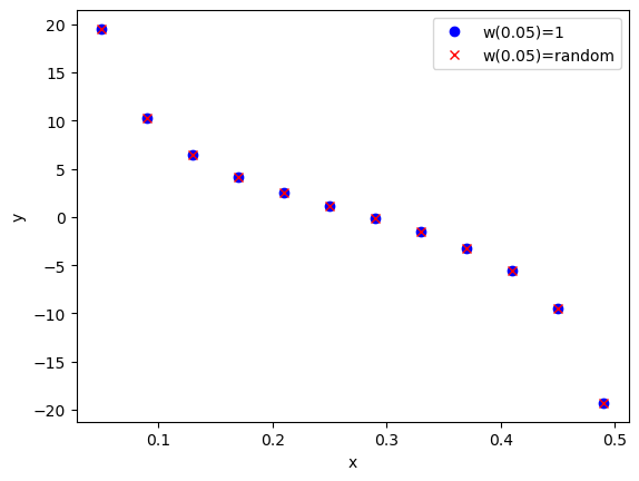Note that in the transformed ODE for w(x), the initial condition is w'(0.05)/w(0.05) = 19.53, namely we the values for w(0.05) can be chosen arbitrarily. For example, we can simply take w(0.05) = 1, then w'(0.05) = 19.53.