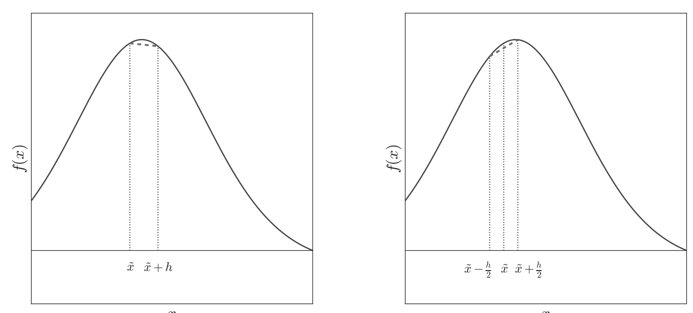 Figure 1: First approximation of a first derivative: forward (left), central (right)