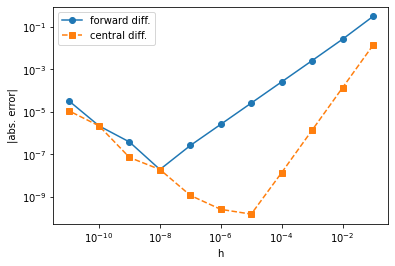 import matplotlib.pyplot as pltplt.loglog(hs,fds,'o-',label='forward diff.')plt.loglog(hs,cds,'s--',label='central diff.')plt.xlabel('h')plt.ylabel('|abs. error|')plt.legend()plt.show()